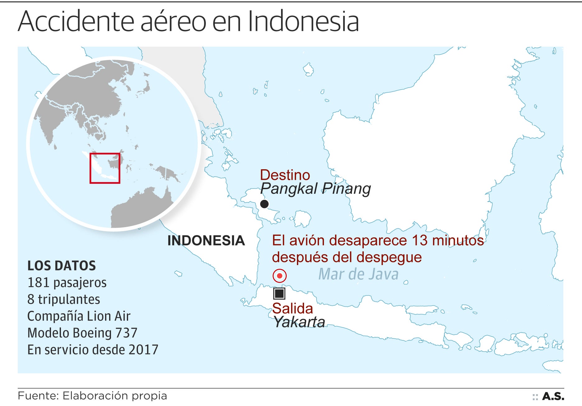 El Boeing 737 que operaba el vuelo JT610 despegó este lunes de Yakarta, la capital de Indonesia, a las 6:20 horas. Tendría que haber llegado a su destino, Pangkal Pinang, en poco más de sesenta minutos. Sin embargo, los pilotos declararon una emergencia por un fallo técnico cuando apenas llevaban diez minutos de vuelo. Aunque los controladores dieron permiso para que el avión de Lion Air diese la vuelta, la tripulación fue incapaz de controlarlo y el aparato se estrelló en el mar, al norte de la isla de Java, a las 6:33 horas.