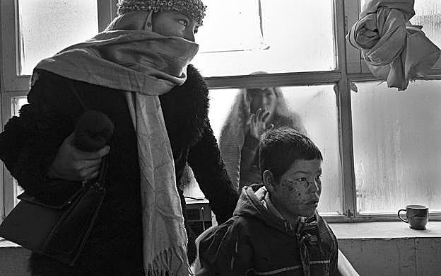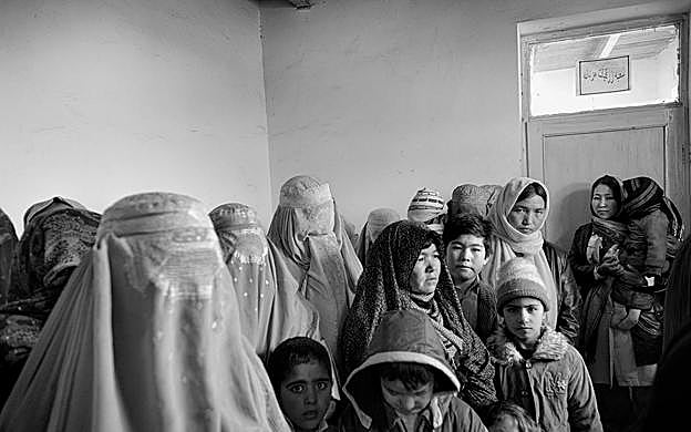 Un grupo de mujeres y niños espera para ser atendido en el Instituto de Malaria y Leishmaniasis, que recibe decenas de nuevos pacientes al día. Estas enfermedades se propagan a través de los mosquitos, que se reproducen fácilmente en las casas en ruinas de Kabul.