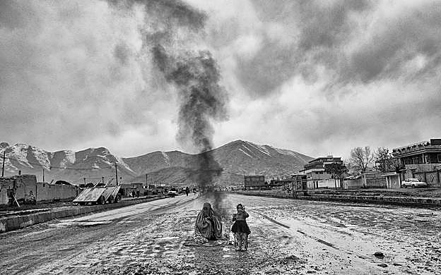 Una mujer con burka y una niña se sientan en medio de un camino embarrado frente a una hoguera. Más de 3,5 millones de refugiados afganos regresaron a Afganistán desde Irán y Pakistán tras la caída de los talibanes en 2001. Ahora tienen un país en ruinas, sin trabajo ni vivienda para ellos.