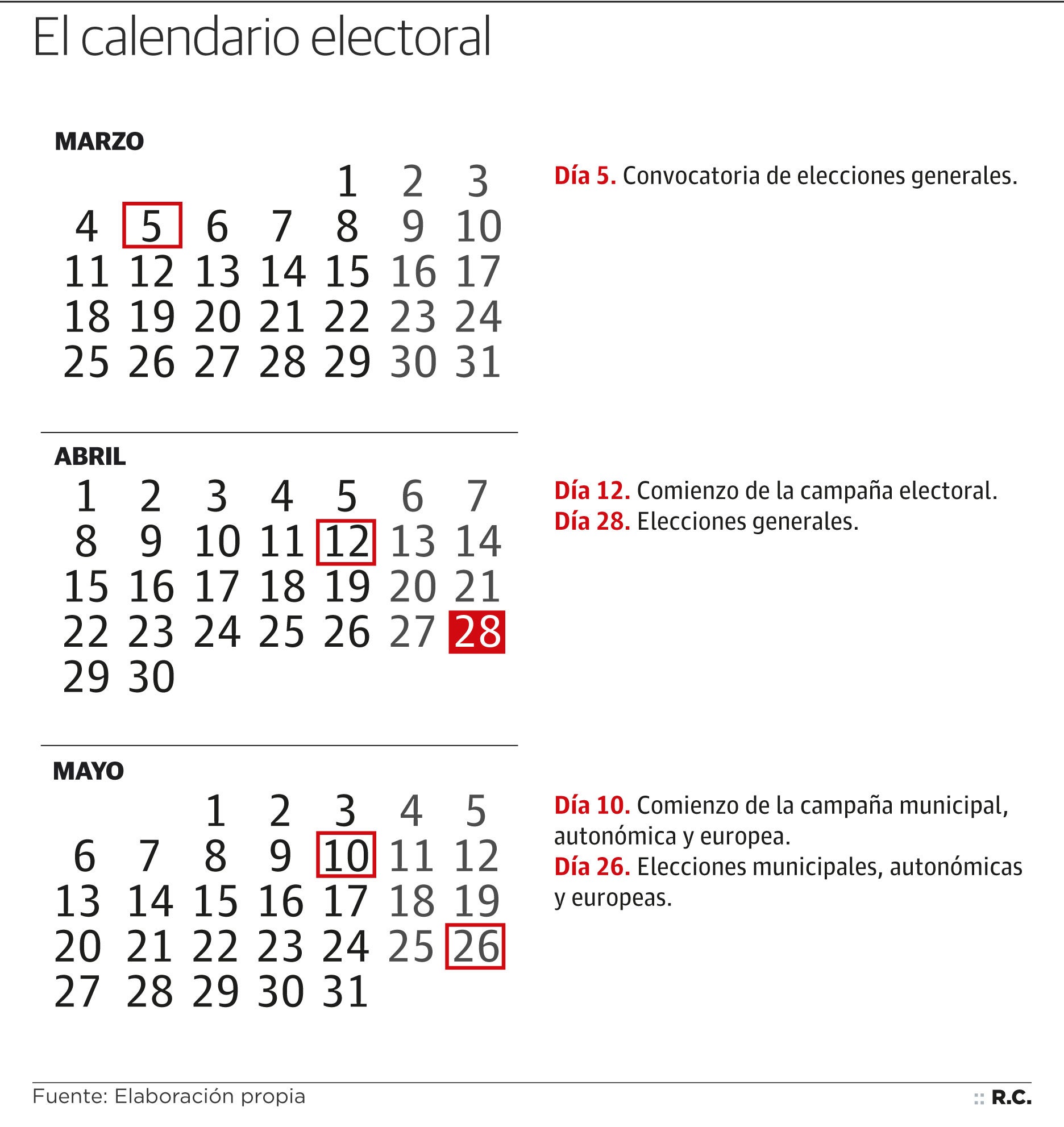 Con el anuncio del presidente del Gobierno, Pedro Sánchez, de convocar Elecciones Generales el próximo 28 de abril, se evita el 'superdomingo electoral', pero se abre por delante un calendario que contará con distintos días claves durante los próximos tres meses.