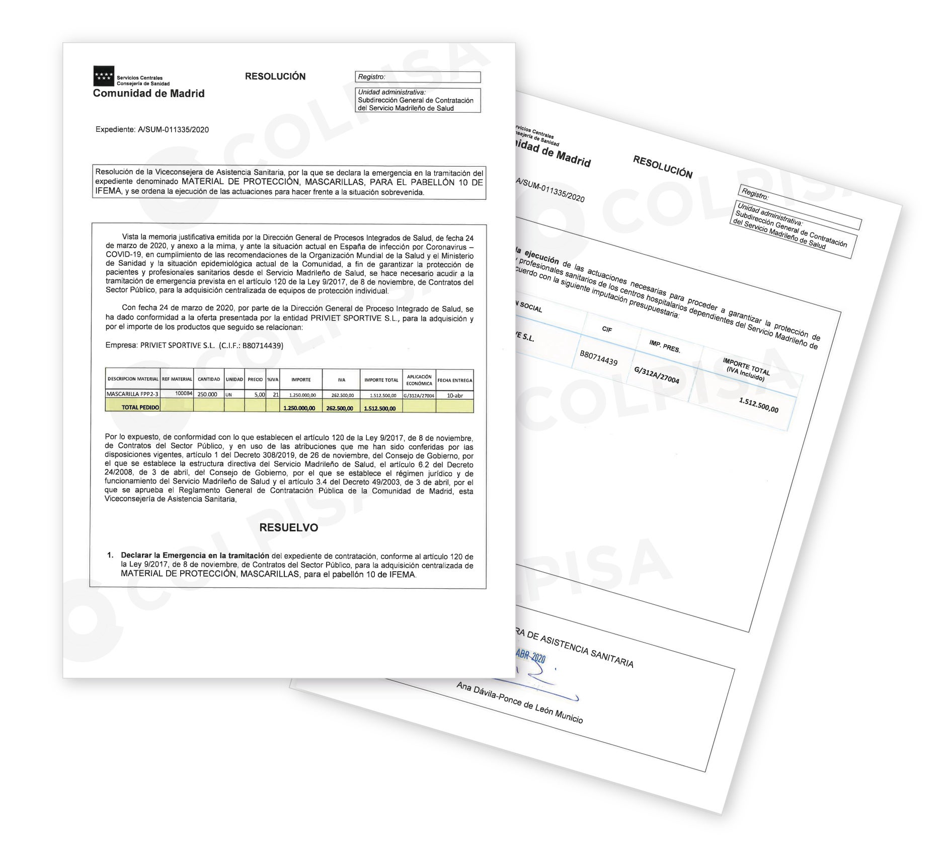 Según la resolución que firmó la viceconsejera de Asistencia Sanitaria, Ana Dávila-Ponce de León, las mascarillas compradas a Sportive fueron destinadas a «garantizar la protección de pacientes y profesionales sanitarios» del Pabellón 10 de Ifema, convertido entonces en un improvisado hospital de campaña para los contagiados. Las mascarillas, según las fuentes consultadas, llegaron el 10 de abril de 2020, diez días después de la adjudicación, y fueron repartidas de inmediato.