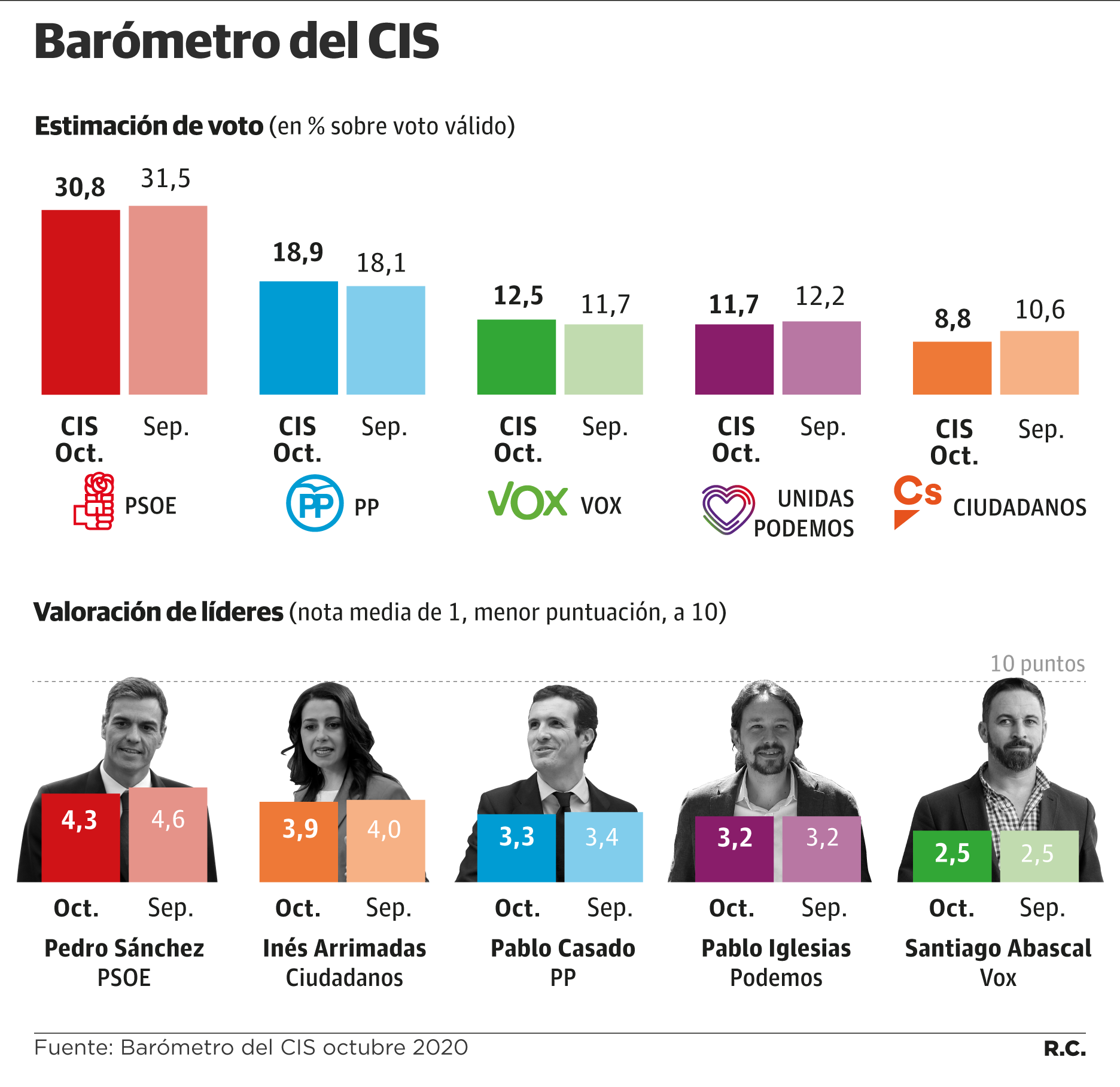 La foto general, de todas maneras, apenas experimenta variaciones respecto a los sucesivos barómetros del CIS, que consolidan al PSOE como primera fuerza y al PP a continuación. Vox y Unidas Podemos se disputan la tercera posición, y Ciudadanos, tras varios meses de recuperación, se ven relegados a la quinta.