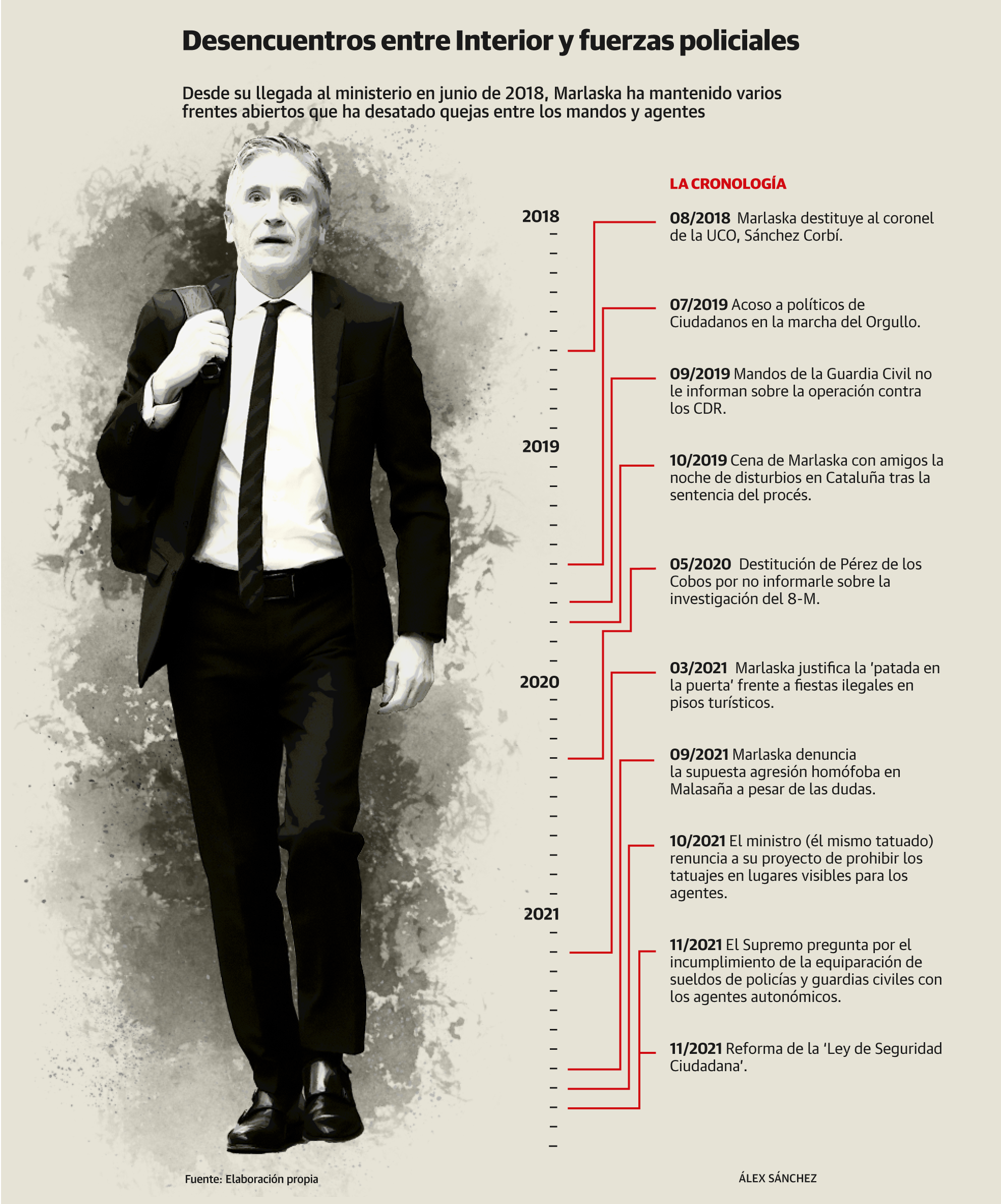 La principal diferencia entre lo ocurrido entonces y el ambiente que reina estos días es la propia figura del ministro del Interior y sus formas. Mientras que hace casi 15 años los funcionarios, a pesar de su beligerancia, nunca llegaron a romper del todo puentes con Rubalcaba (quien acabó reconduciendo la situación sin hacer apenas cesiones por la crisis económica de 2008), ahora es precisamente la persona en sí de Fernando Grande-Marlaska la que encarna el enfrentamiento.