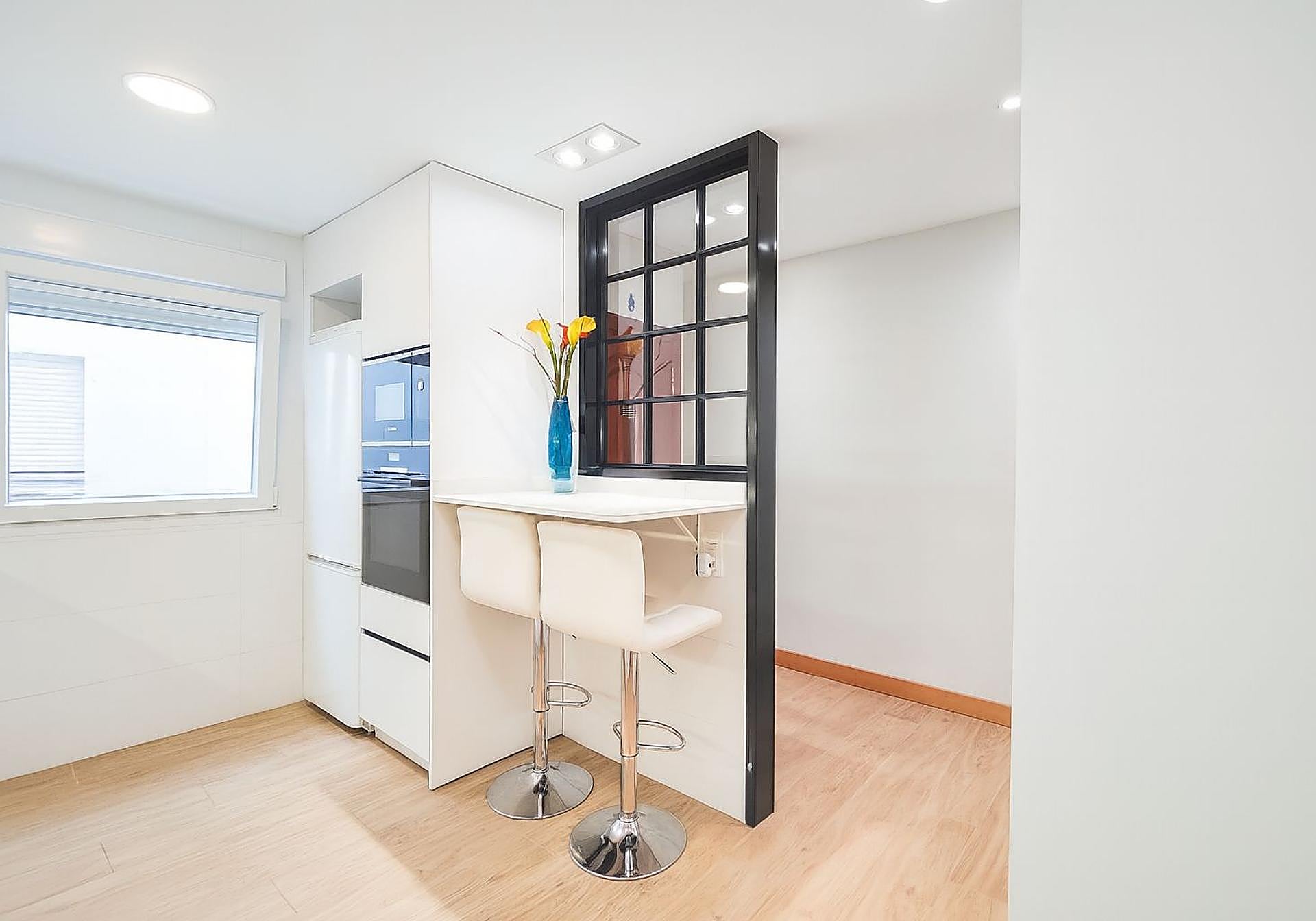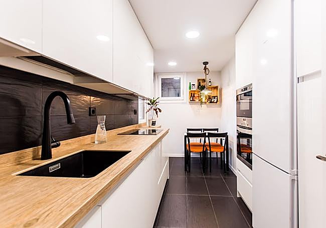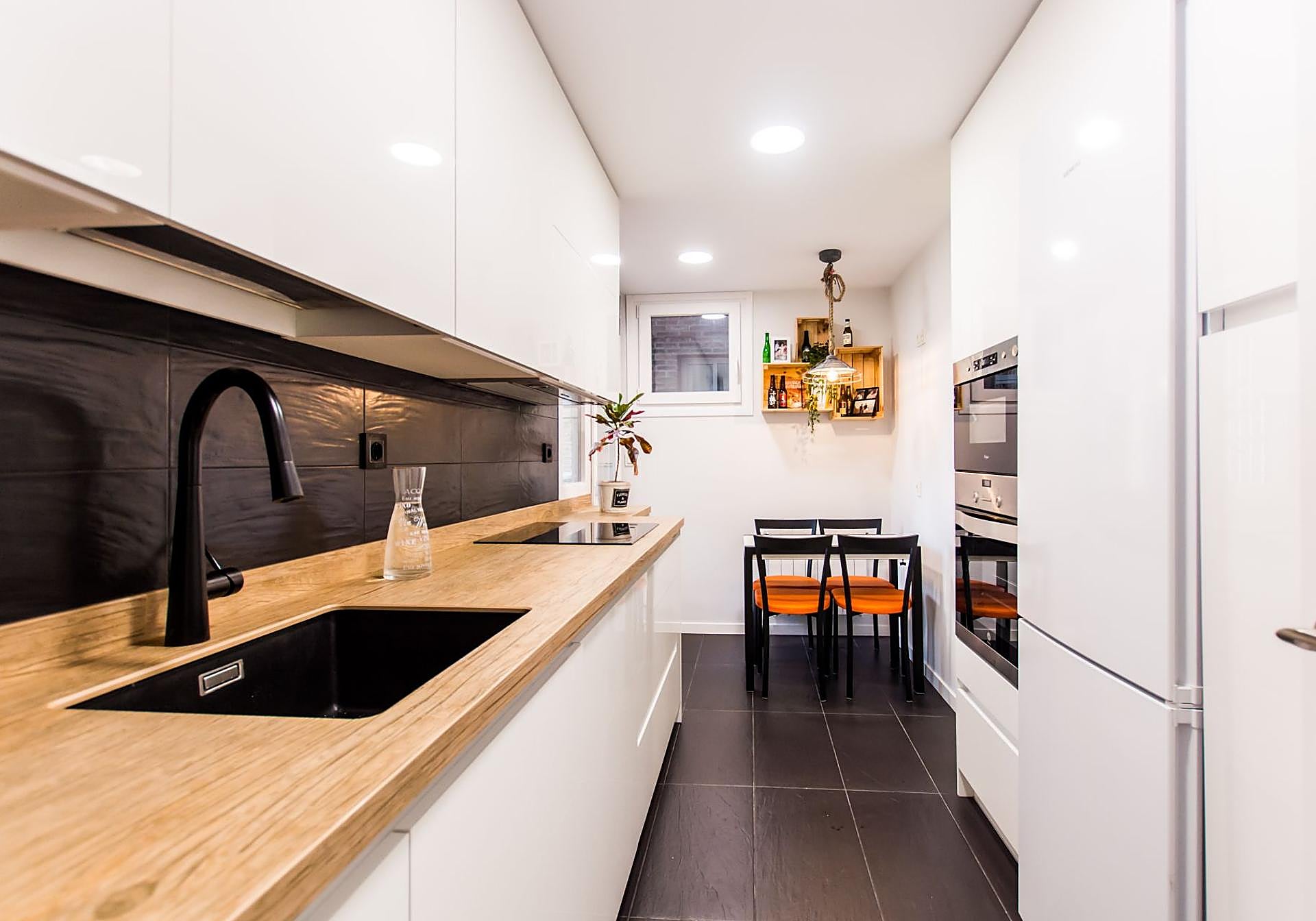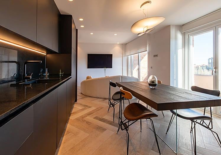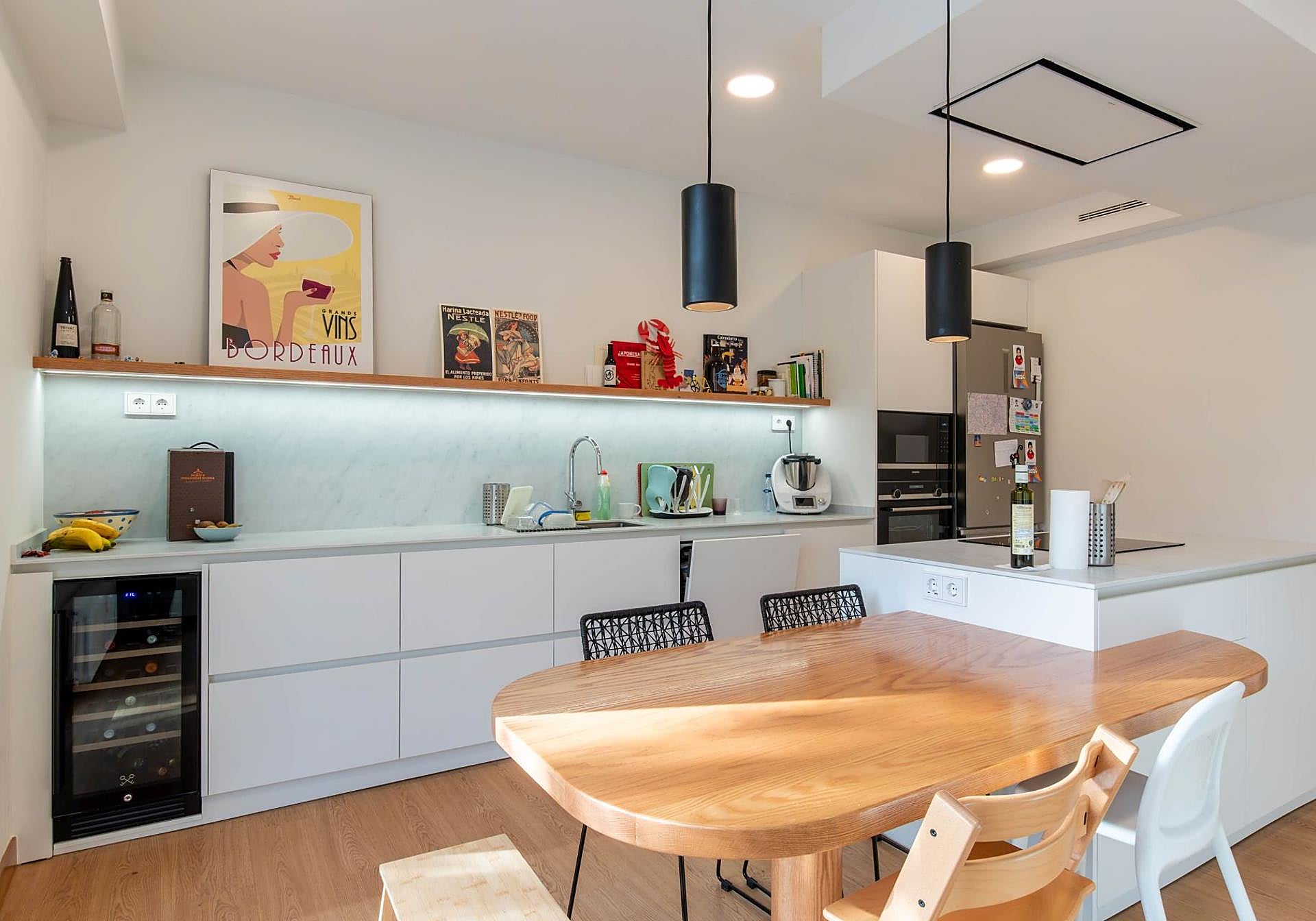 Para generar una separación visual de la cocina, esta empresa de reformas optó por una opción poco habitual hoy en día: muebles de cocina, encimera y mesa de comedor en elegante color wengué. ¿Te lo imaginas en tu cocina?