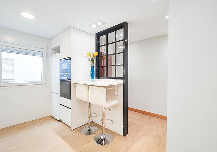 En este piso, la reforma integral generó un espacio de salón-comedor-cocina de concepto abierto. El resultado es una vivienda muy moderna, con un espectacular suelo de madera clara y donde predominan los colores blancos.