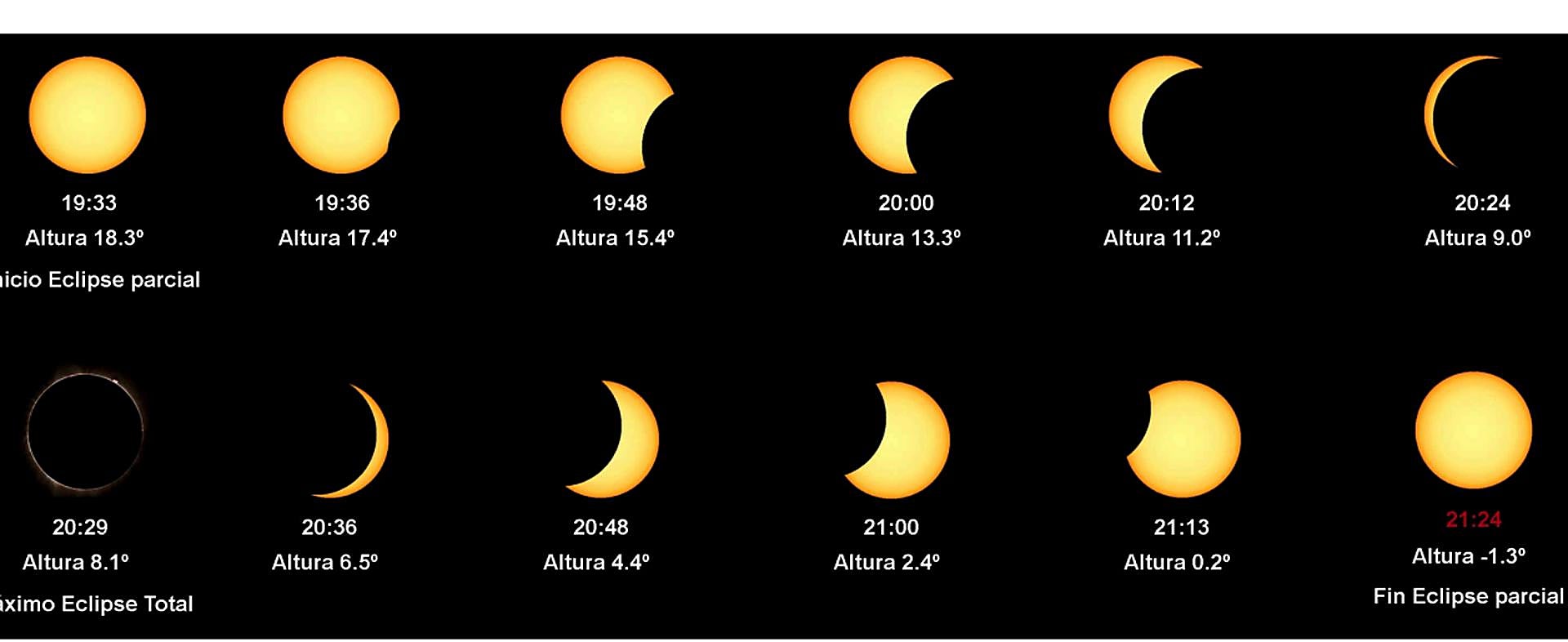 Decenas de pueblos de la provincia están preparando este acontecimiento que tendrá lugar una hora antes de la puesta de Sol, lo que quiere decir que veremos el astro rey en una posición muy baja en el horizonte. El eclipse solar se producirá a 20° 08′ de Leo. Cuando el reloj dé las 20.28 horas y 19 segundos el Sol se ocultará en Burgos. A las 20.30 horas y 3 segundos, el eclipse total de Sol habrá terminado. En total 1 minuto y 44 segundos de penumbra total, minutos antes del anochecer que, por esas fechas, será a las 21.20 horas.