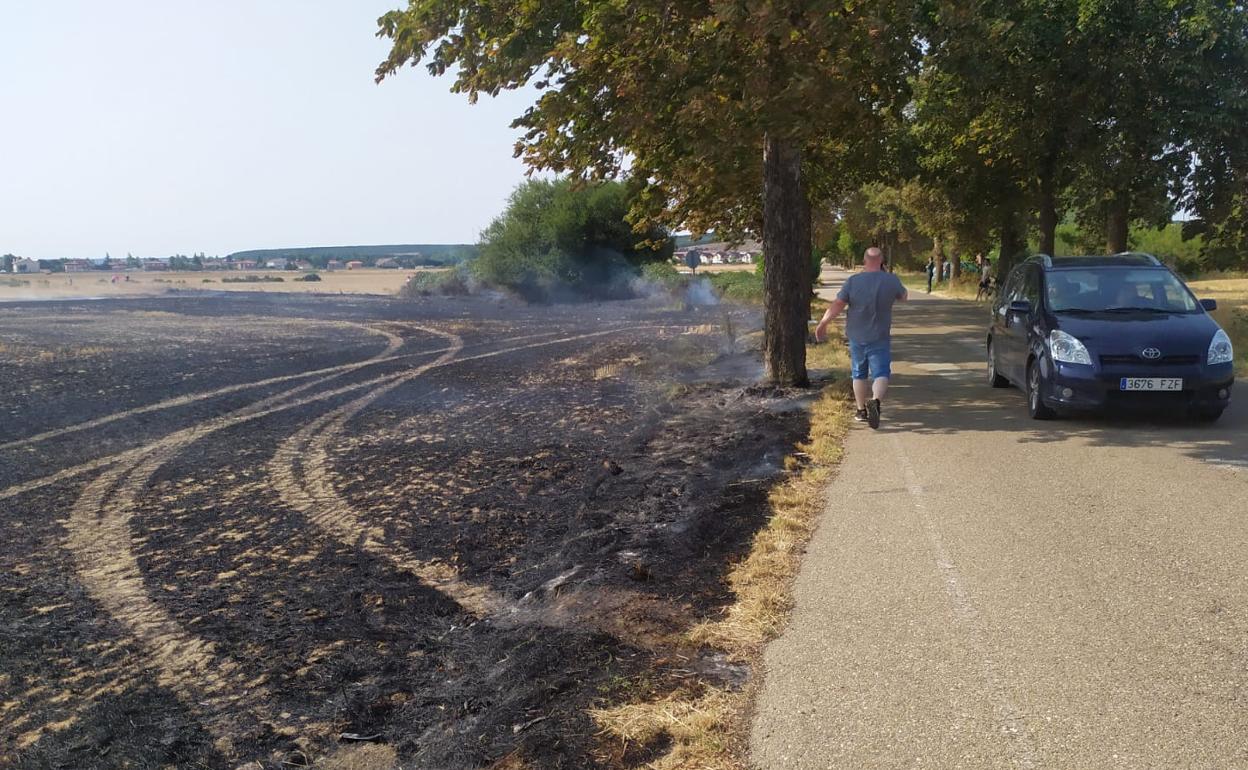 «Llegué diez minutos después de decretarse el incendio. Empezó cerca de la carretera (BU-V-8002) y en pocos minutos avanzó muy rápido. Había un viento fortísimo y eso propició que avanzara a gran velocidad». Así relata lo sucedido un vecino de San Millán de Juarros, donde en la tarde de este lunes se ha originado un fuego que ha hecho peligrar una finca rodeada, además de quemar 16 hectáreas de rastrojo de cereal.