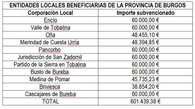 Siete de estas localidades han obtenido la ayuda máxima de 60.000 euros para acondicionar viales en sus territorios (Encío, Valle de Tobalina, Pancorbo, Jurisdicción de San Zadornil, Partido de la Sierra en Tobalina, Busto de Bureba y Cascajares de Bureba), mientras que Briviesca y Oña han recibido una ayuda para la adquisición de un vehículo mientras que el ayuntamiento de Merindad de Cuesta Urría mejorará su centro de coordinación operativa municipal y Medina de Pomar realizará actuaciones en la estación de clasificación y descontaminación.
