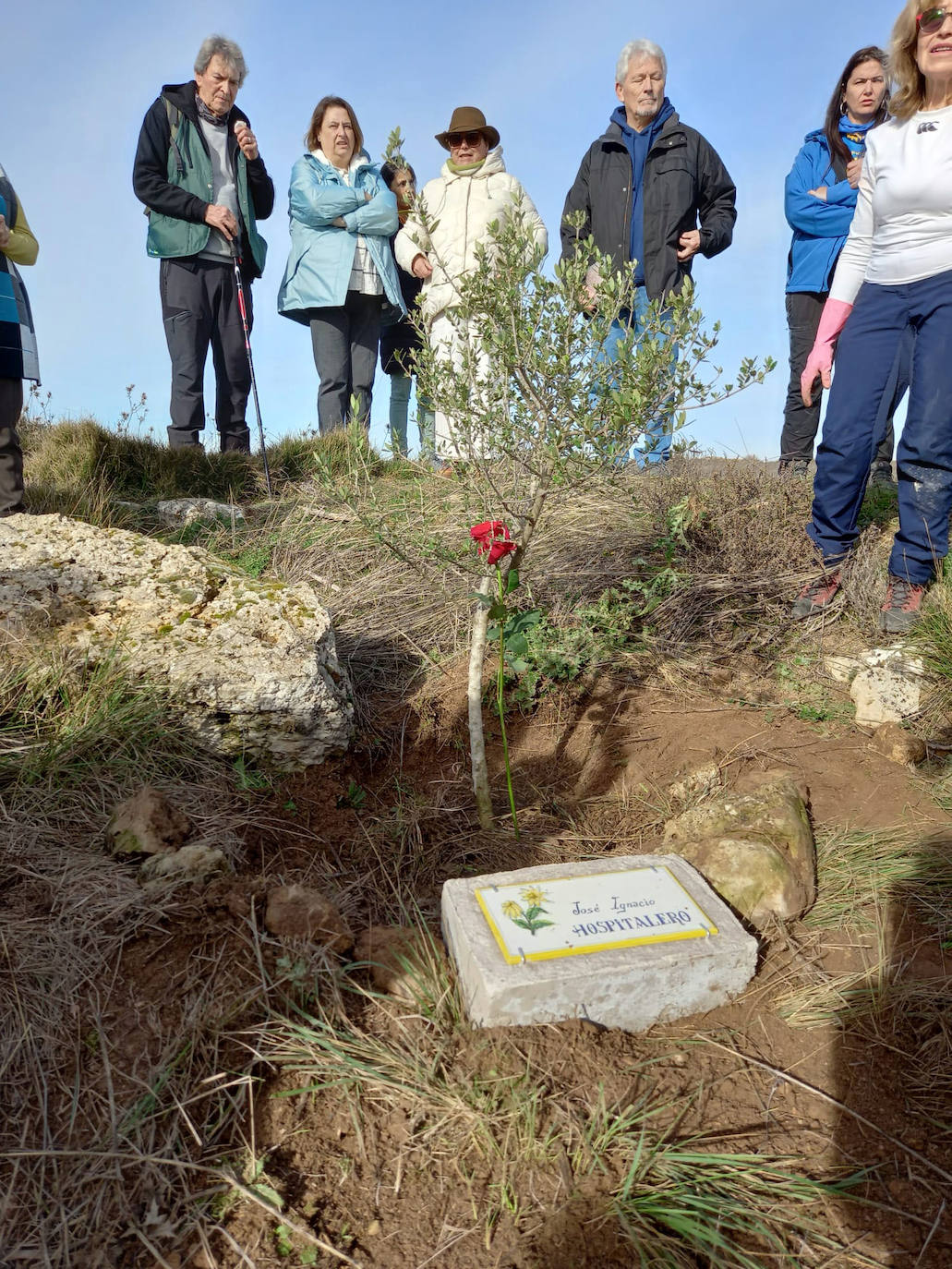 El colectivo Hospitaleros Voluntarios del Camino de Santiago rindió hoy homenaje a tres de sus compañeros fallecidos: Restituto 'Resti' Gutiérrez, Justiniano 'Justi' Infante y José Ignacio Díaz. Para ello, una treintena de personas, llegados de diversas zonas de España, que conocían a los tres homenajeados, subieron hasta el alto de Mostelares, que se ubica en el Camino de Santiago a su salida de Castrojeriz para plantar tres árboles y colocar sendas placas a sus pies.