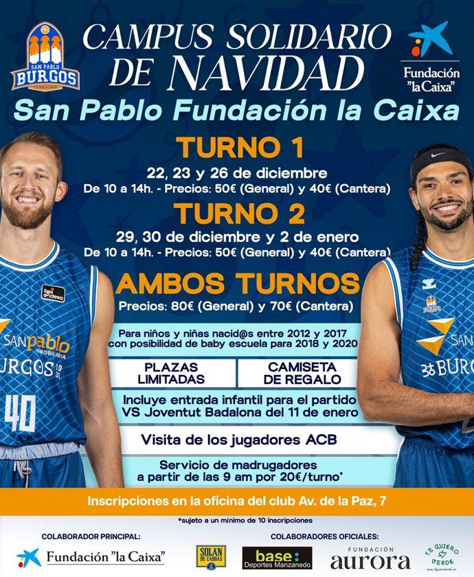 El San Pablo Burgos pone en marcha una nueva edición del Campus Solidario de Navidad, 'San Pablo Fundación la Caixa', que en este año volverá a contar con la colaboración principal de la acción social de la entidad financiera, además de la estrecha participación de Fundación Aurora, junto al apoyo de los colaboradores oficiales Solán de Cabras, base: Deportes Manzanedo y Te Quiero Verde.