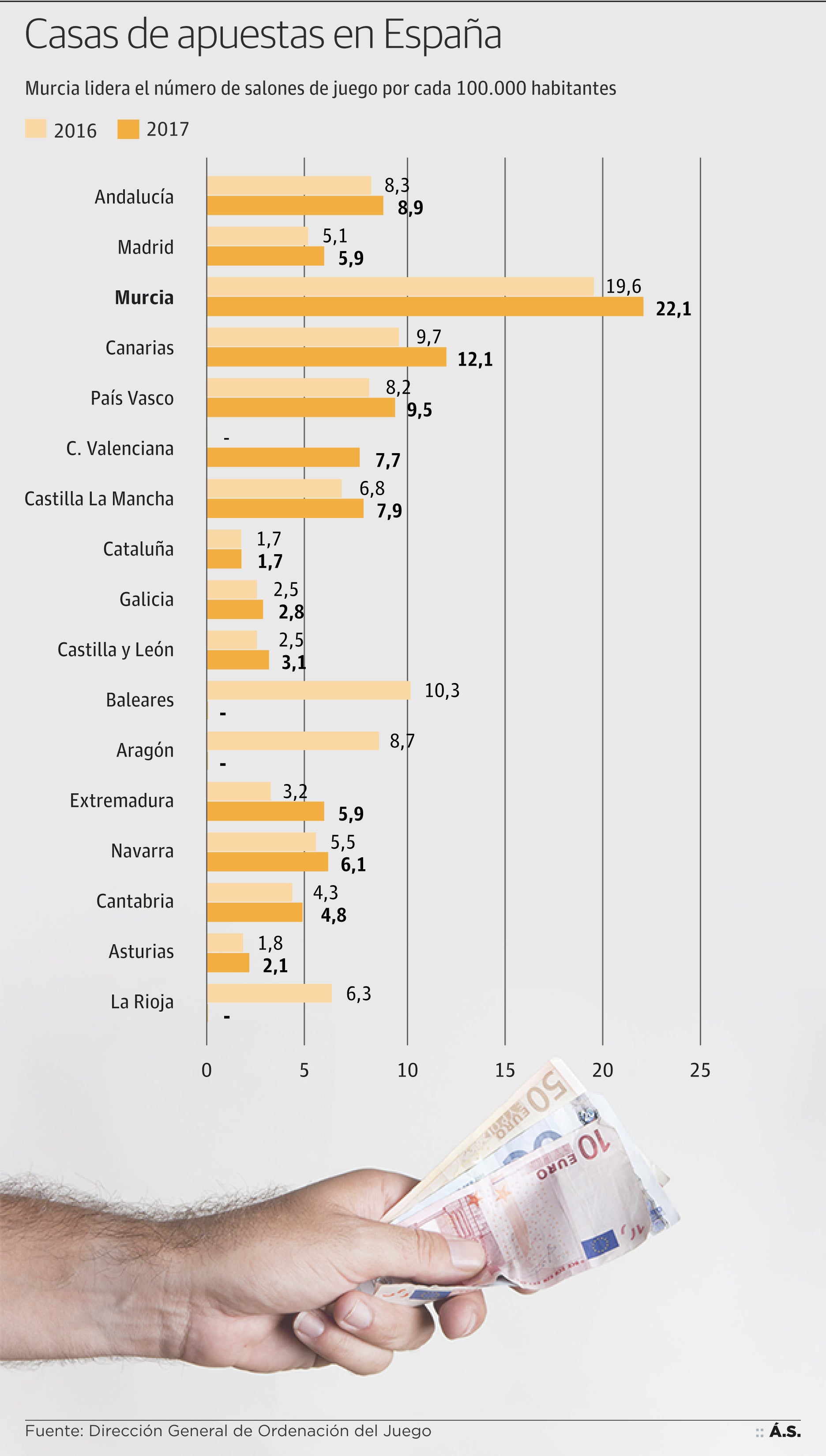 • 1.681 millones de euros gastados en apuestas presenciales (no online) en 2017.