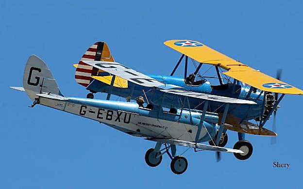 En la parte exterior de la imagen vuela un biplaza Havilland DH-60X Moth de 1928. En la interior, planea un Boeing A75-N1 Stearman, un avión de entrenamiento militar de 1944. Es muy conocido porque precisamente ese modelo persigue a Cary Grant en la película 'Con la muerte en los talones'.