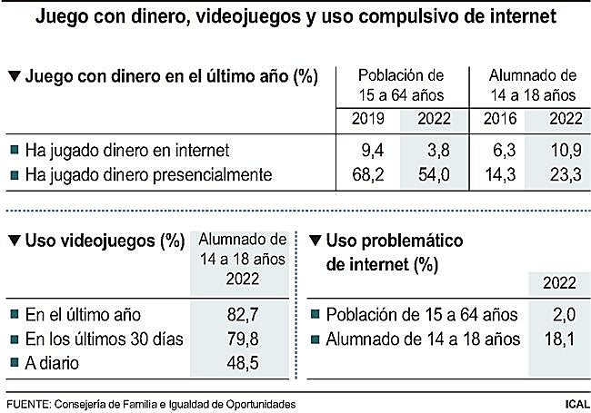 Dos de cada diez jóvenes de 14 a 18 años de Castilla y León hace un uso «compulsivo» de internet, mientras que la mitad de los adolescentes utiliza a diario los videojuegos y el 3,5 por ciento de forma problemática, según se desprende del borrador del Plan Autonómico de Castilla y León sobre Adicciones 2024-2030 al que ha tenido acceso Ical y donde también se advierte del incremento de estudiantes que realizan apuestas por internet, que ya alcanza el 10,9 por ciento.