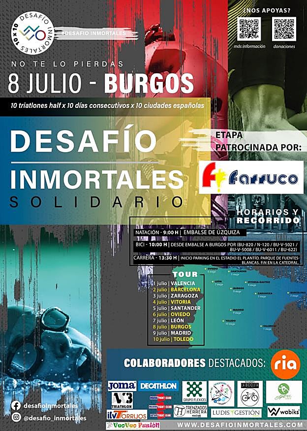 Valencia, Barcelona, Zaragoza, Vitoria, Santander, Oviedo, Burgos, Madrid y Toledo. Ese es el reto solidario. En Burgos, la primera prueba arrancará a primera hora de la mañana en el pantano de Úzquiza, donde nadarán 2.900 metros. Luego, en bicicleta recorrerán una distancia de 90 kilómetros hasta llegar a Burgos capital. Y el recorrido a pie se iniciará entre las 15:00 y las 16:00.