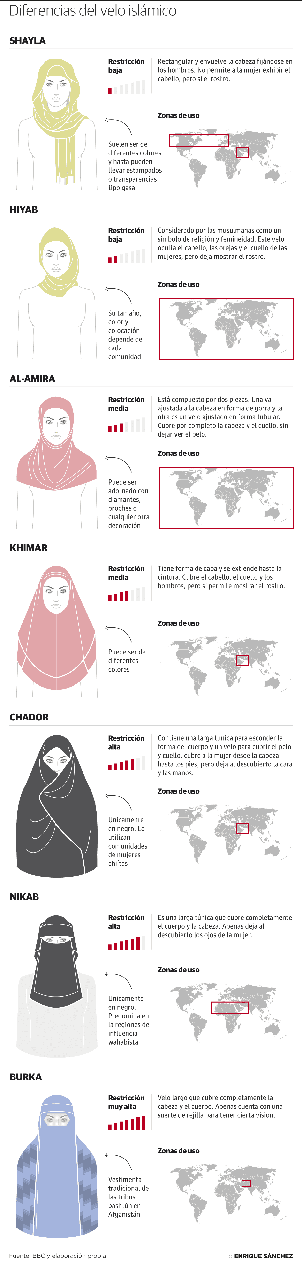 Francia es el principal impulsor de la prohibición del burka en Europa. Con sus cinco millones y medio de ciudadanos con creencias musulmanas aprobó en 2010 una ley que prohibía el uso del burka y niqab en las vías públicas. Una ley que fue más restrictiva que la anterior: en 2004, Francia prohibió el uso de cualquier símbolo religioso –velos o crucifijos por ejemplo– en los centros educativos –excepto universidades–.