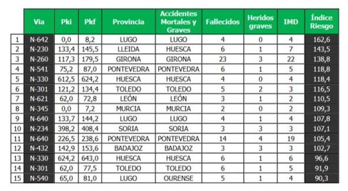 Los 15 peores tramos de riesgo de las carreteras españolas son los siguientes: