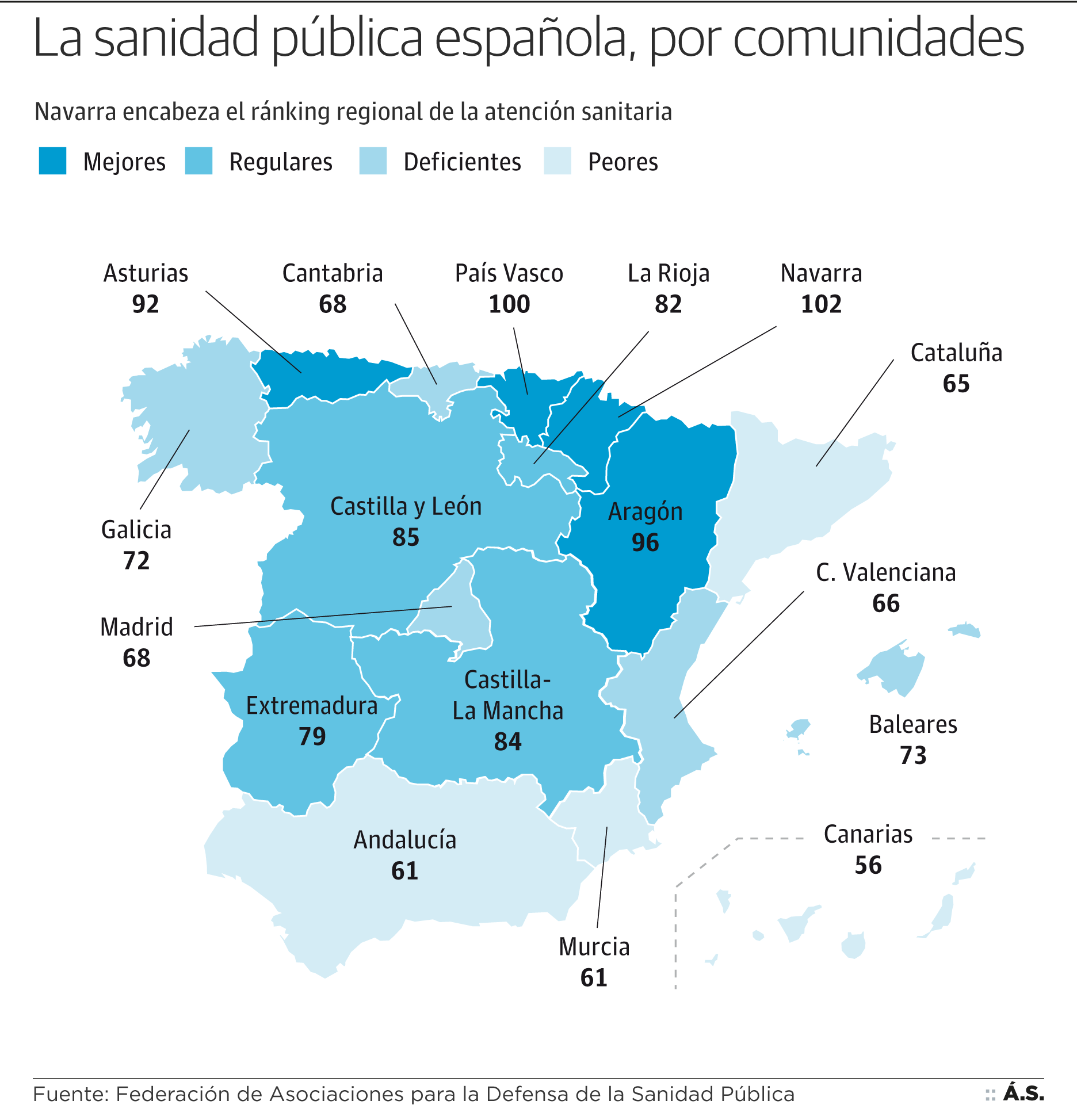 El estudio analiza aspectos como el gasto per cápita en sanidad, camas, quirófanos y médicos por 1.000 habitantes, listas de espera, gasto farmacéutico o externalización de servicios y otorga una puntuación a cada comunidad autónoma. Navarra ha logrado 102 puntos, casi el doble que Canarias, que se ha quedado en 56. Son diferencias «claramente excesivas y no razonables, ha apuntado el presidente de FADSP, Marciano Sánchez Bayle, durante la presentación del informe, que utiliza datos de la OCDE, la OMS, Eurostat, HAQI (The Lancet) e indicadores claves del Sistema Nacional de Salud.