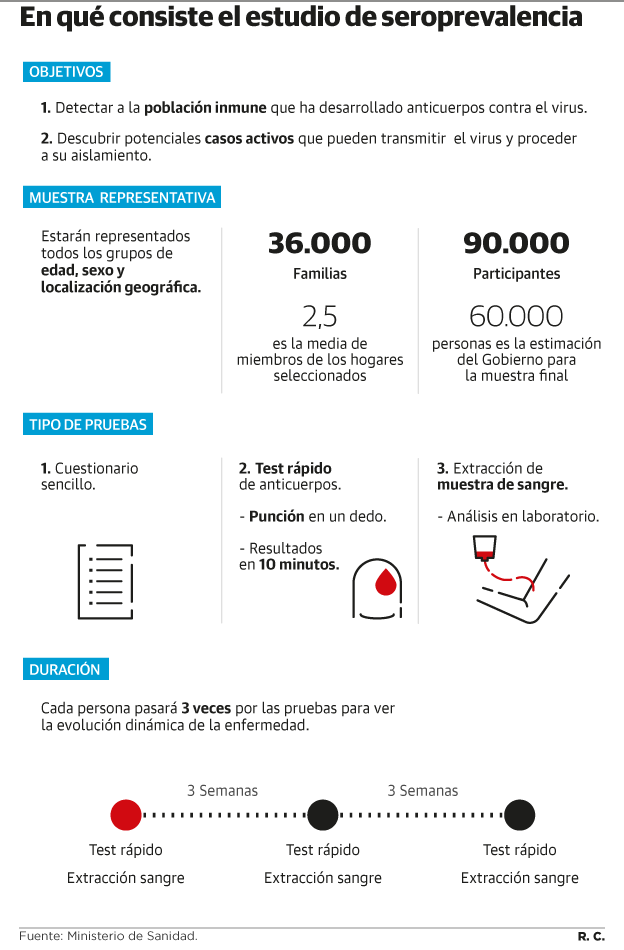 Es en base a este calendario de tres repeticiones por el que Sanidad espera tener los primeros datos preliminares tras la primera oleada de pruebas que se extenderá durante los próximos catorce días. No obstante, los resultados finales del este macroestudio no estarán en ningún caso antes de la semana del 8 de junio, casi tres meses después de decretarse el estado de alarma.