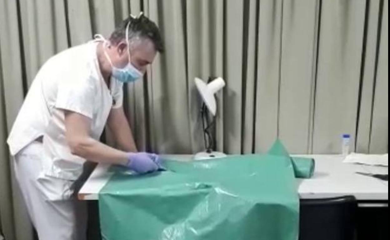 Un sanitario enseña a fabricar un delantal de protección contra el coronavirus con bolsas de plástico