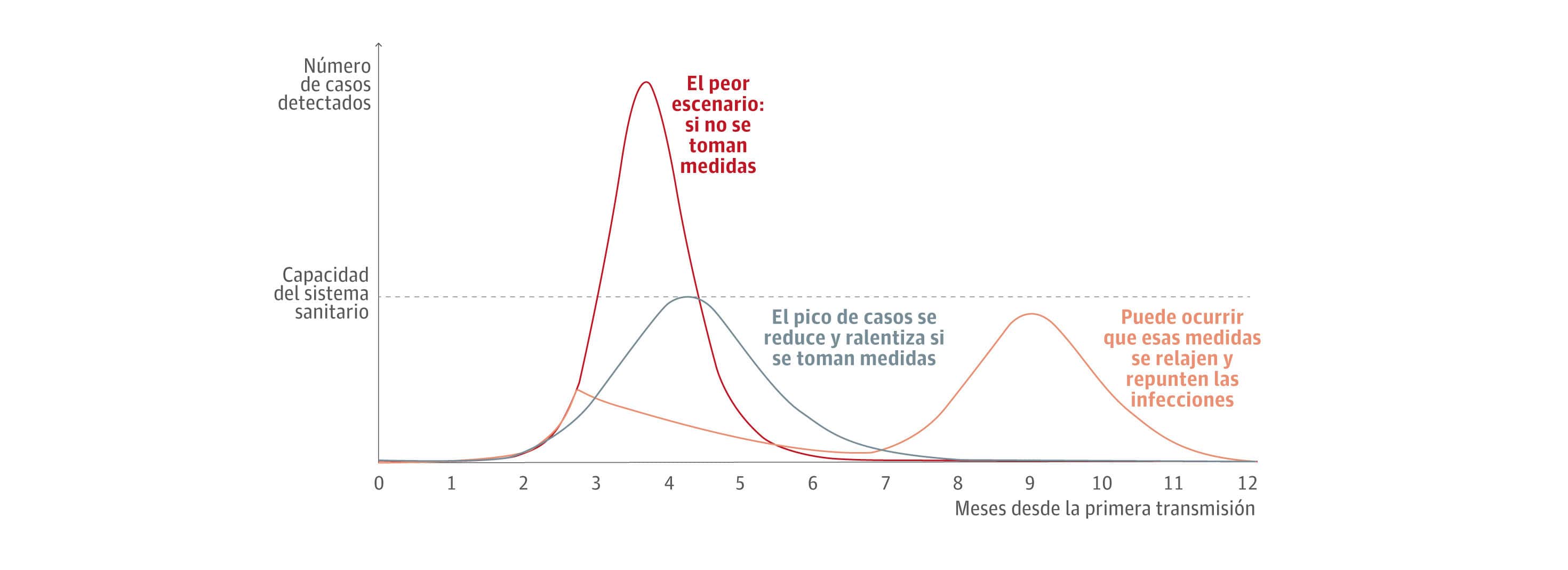 Como muestra un referenciado estudio liderado por el epidemiólogo británico Roy Anderson y publicado por la revista científica 'The Lancet', una rápida propagación del virus provoca que esta curva de contagiados sobrepase el límite del sistema sanitario, contribuyendo a su colapso. De ahí surge el objetivo que se han marcado las autoridades de diferentes países de «aplanar la curva» . Es decir, que los contagios se vayan espaciando en el tiempo y evitar un pico pronunciado.