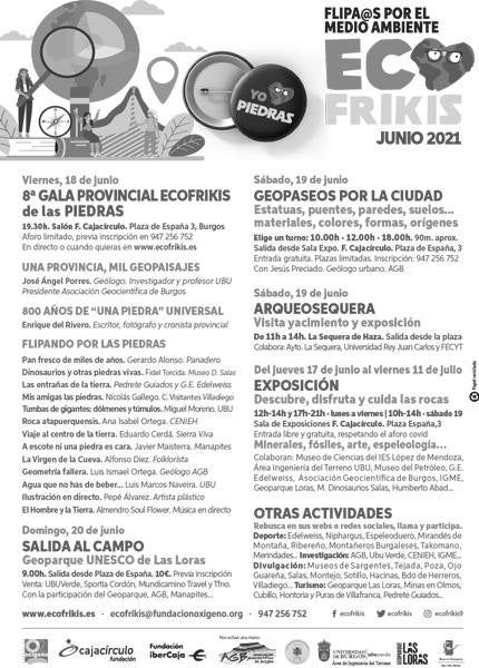 Ademaás, desde el jueves 17 de junio al viernes 11 de julio, se podrá visitar la exposición 'Descubre, disfruta y cuida las rocas' que permanecerá abierta de lunes a viernes en la sala de la Fundación Cajacírculo de la plaza de España en Burgos, con posibilidad de visita guiada para grupos. Entrada sin inscripción.