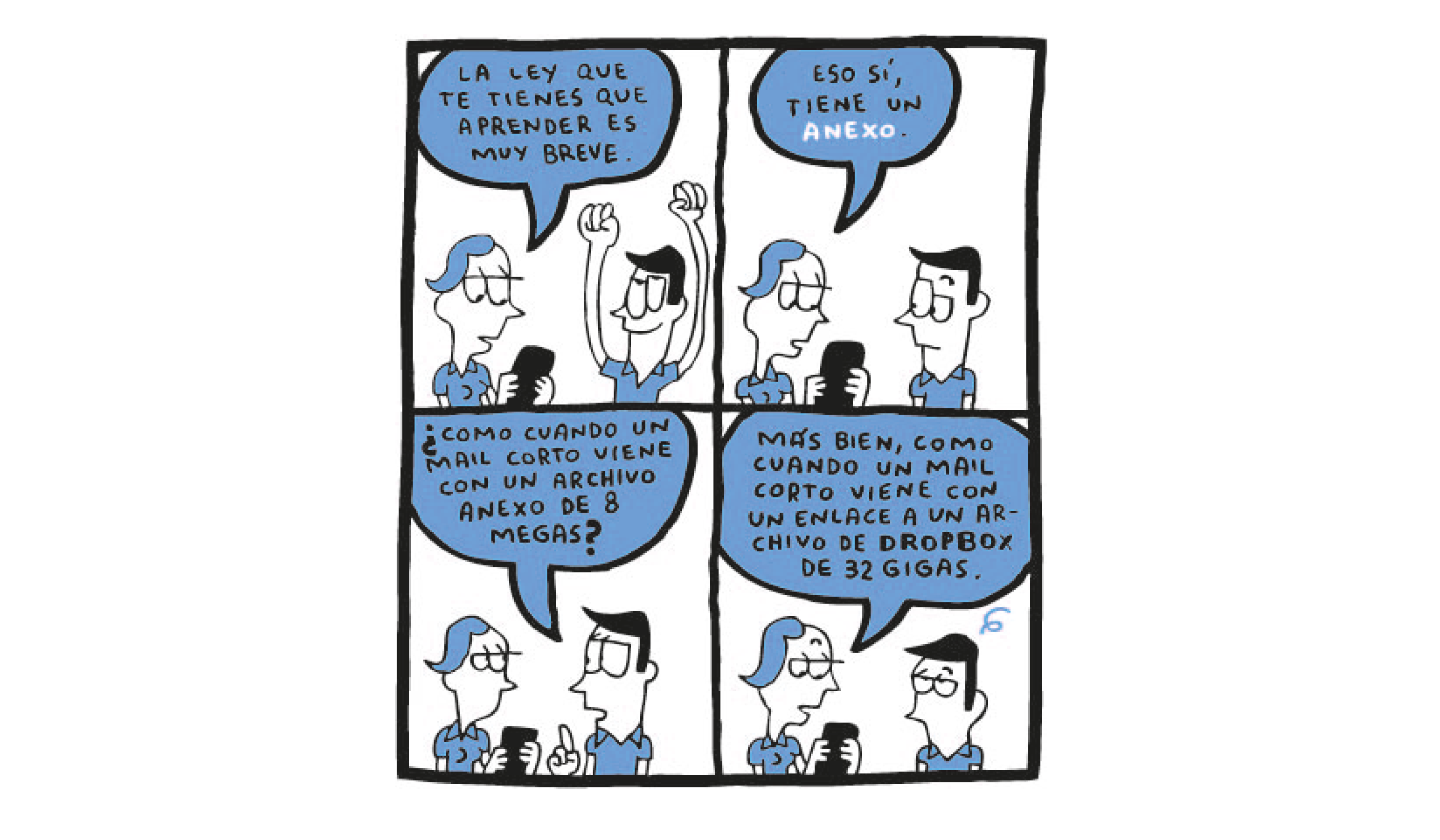 Los dibujos de Mauro Entrialgo para el libro publicado junto a la periodista Eva Belmonte 'Diccionario ilustrado BOE-español. Aprende el idioma que dicta las normas. Y sus recovecos' (ed. Ariel) expresan bien lo que pasa cuando uno se enfrenta al Boletín Oficial del Estado (BOE). Ojos mirando hacia arriba, uno algo más cerrado, ceja enarcada y un remolino sobre la cabeza, como de cortocircuito mental, de estropicio. Ese chico que reclama a su novia: «Pero si la semana pasada dijiste que me querías...». Y ella: «Ya, pero hoy quedan derogadas cuantas afirmaciones mías de igual o inferior rango se opongan o contradigan lo que acabo de decir». ¿Un chiste? No tanto.